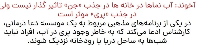 در یکی از برنامههای مذهبی مربوط به یک موسسه دعا درمانی، کارشناس ادعا میکند که به خاطر وجود پری در آب، افراد نباید شبها به ساحل دریا یا رودخانه نزدیک شوند.