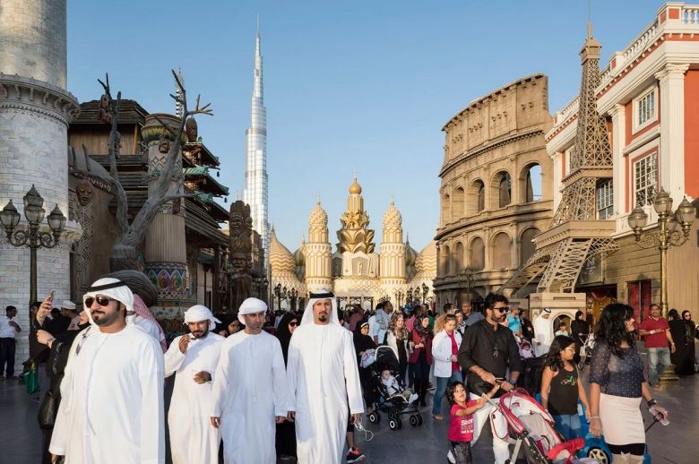 Many images from the series focus on leisure spaces such as luxury resorts, shopping malls, rooftop pools, and entertainment complexes. People are shown relaxing, posing, swimming, or consuming experiences designed for comfort and pleasure. At first glance, the atmosphere appears playful and carefree.