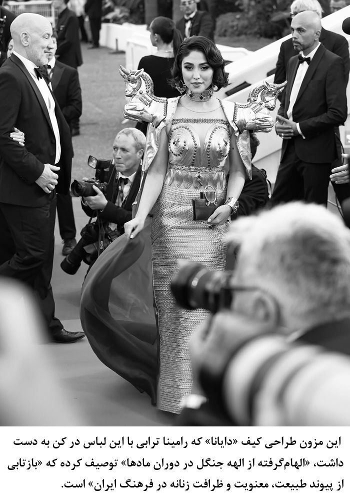 The bold accessories, including a custom clutch and structured shoulder adornments, were crafted by Brikad, a design studio specializing in jewelry and ornamental fashion pieces. In an interview with the BBC, the studio explained the symbolism behind their work: “The Achaemenid bull motif from the Apadana Palace represents strength, resilience, and the majesty of ancient Persian civilization — a reminder of our rich cultural heritage.”